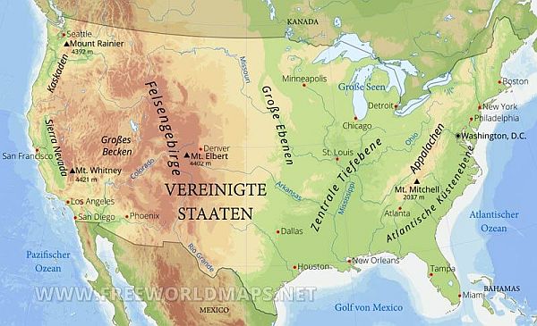 | Die USA sind ein Land mit 50 Bundesstaaten, die einen Großteil von Nordamerika einnehmen, wobei sich Alaska im Nordwesten des Kontinents und Hawaii im Pazifik befindet. Die wichtigsten Städte an der Atlantikküste sind New York, ein globales Finanz- und Kulturzentrum, sowie die Hauptstadt Washington, DC. Die Metropole Chicago im Mittleren Westen ist für ihre einflussreiche Architektur bekannt. Das zu Los Angeles gehörende Hollywood an der Westküste ist ein berühmter Ort der Filmbranche. |