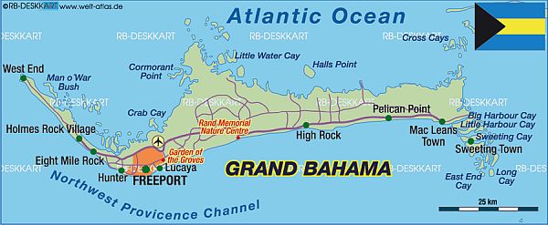 | Grand Bahama ist die nördlichste Insel der im Atlantik gelegenen Bahamas. Neben ihren Stränden, korrallenriffgesäumten Buchten und Mangrovensümpfen ist die Insel auch für ihre All-inclusive-Ferienanlagen und Golfplätze bekannt. Die größte Stadt Freeport liegt in der Nähe beliebter Strände wie Xanadu. Auf dem internationalen Basar können Touristen zollfrei einkaufen. Am Port Lucaya Marketplace wird bahamaische Musik gespielt und Kunsthandwerk aus Stroh angeboten. |