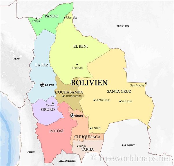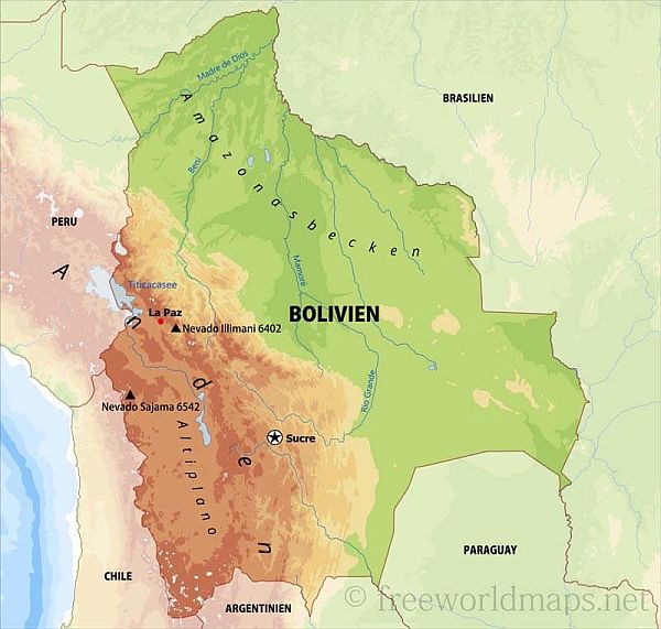 | Bolivien ist ein Land im zentralen Südamerika mit einer vielfältigen Landschaft, die von den Anden über die Atacamawüste bis zum Regenwald im Amazonasbecken reicht. Der auf über 3.500 m liegende Regierungssitz La Paz befindet sich auf dem Altiplano-Plateau der Anden vor der Kulisse des schneebedeckten Gipfels des Illimani. Der nahe gelegene spiegelglatte Titicaca-See ist der größte See des Kontinents. Durch ihn verläuft die Grenze zu Peru. |