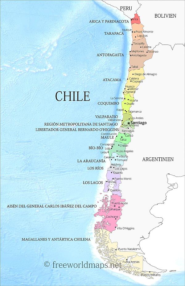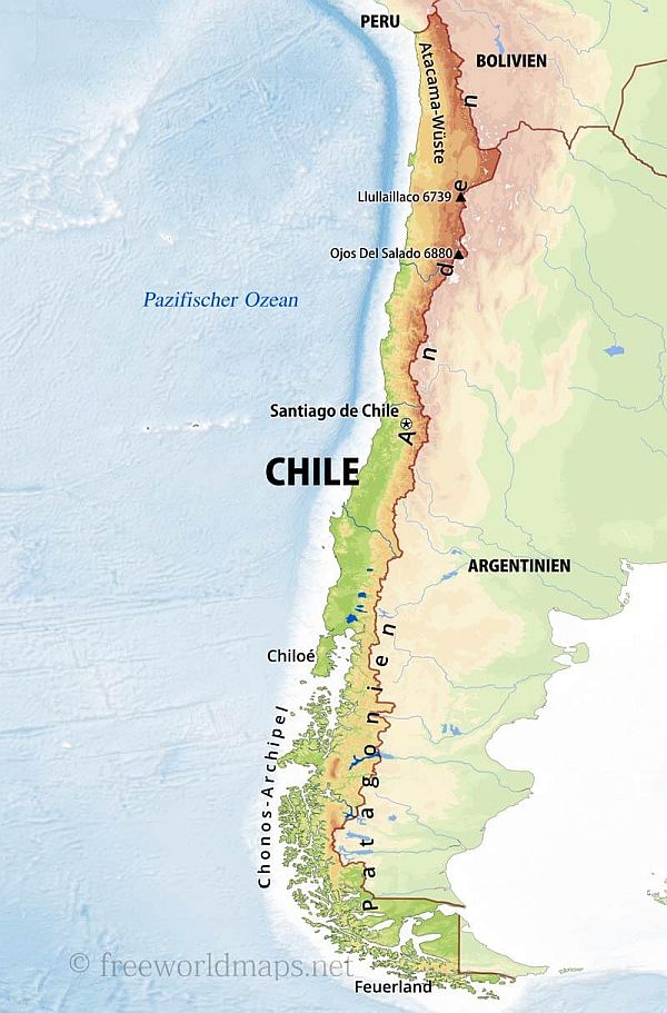 | Chile ist ein langes, schmales Land, das sich an der westlichen Seite Südamerikas erstreckt und eine Pazifikküste über eine Küsten von über 6.000 km aufweist. Die Hauptstadt Santiago liegt in einem Tal, das von den Anden und der chilenischen Küstengebirgskette umgeben ist. Am von Palmen gesäumten Platz Plaza de Armas in der Stadt liegen die klassizistische Kathedrale und das nationale historische Museum. |