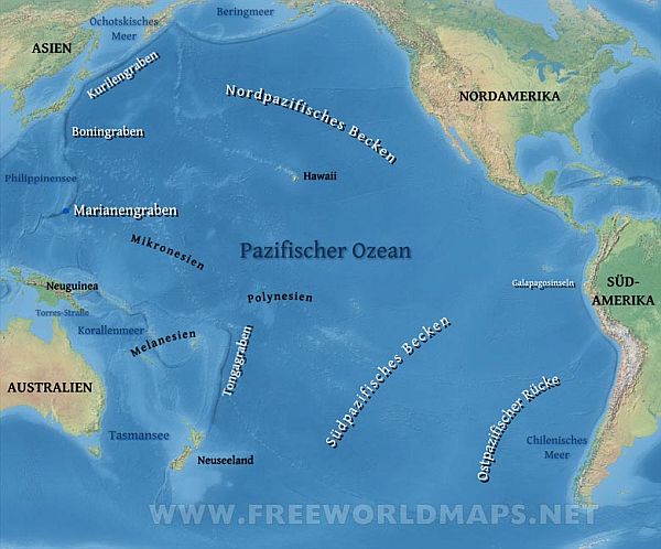 | Der Pazifische Ozean oder Pazifik, auch Stiller Ozean oder Großer Ozean genannt, ist der größte und tiefste Ozean der Erde und grenzt an alle anderen Ozeane. Die Pazifische Küste erstreckt sich, im Uhrzeigersinn, über Neuseeland, Australien, Ostasien und die Westküste von Nord- und Südamerika. | |