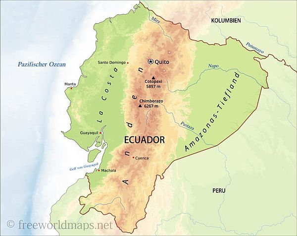 | Ecuador ist ein Land an der Westküste Südamerikas und liegt am Äquator. Die vielfältige Landschaft umfasst Amazonasdschungel, das Andenhochland und die Galapagosinseln mit einer artenreichen Tierwelt. Die Hauptstadt Quito liegt in den Ausläufern der Anden auf einer Höhe von 2.850 m. Bekannt ist die Stadt für ihr größtenteils intaktes Zentrum aus der spanischen Kolonialzeit mit prächtigen Palästen aus dem 16. und 17. Jh. und religiösen Stätten wie der prunkvollen Kirche Compañía de Jesús. |